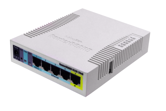 The RB951Ui-2HnD is a wireless SOHO AP with a new generation Atheros CPU and more processing power. It has five Ethernet ports, one USB 2.0 port and a high power 2.4GHz 1000mW 802.11b/g/n wireless AP with antennas built in.